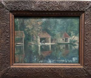 シスレーの作品に描かれているのは川なので水に動きを感じましたが、この「グレーの洗濯場」では、水面に反映している建物の影が動いていないので、沼や大きな池のようなところなのでしょうか。